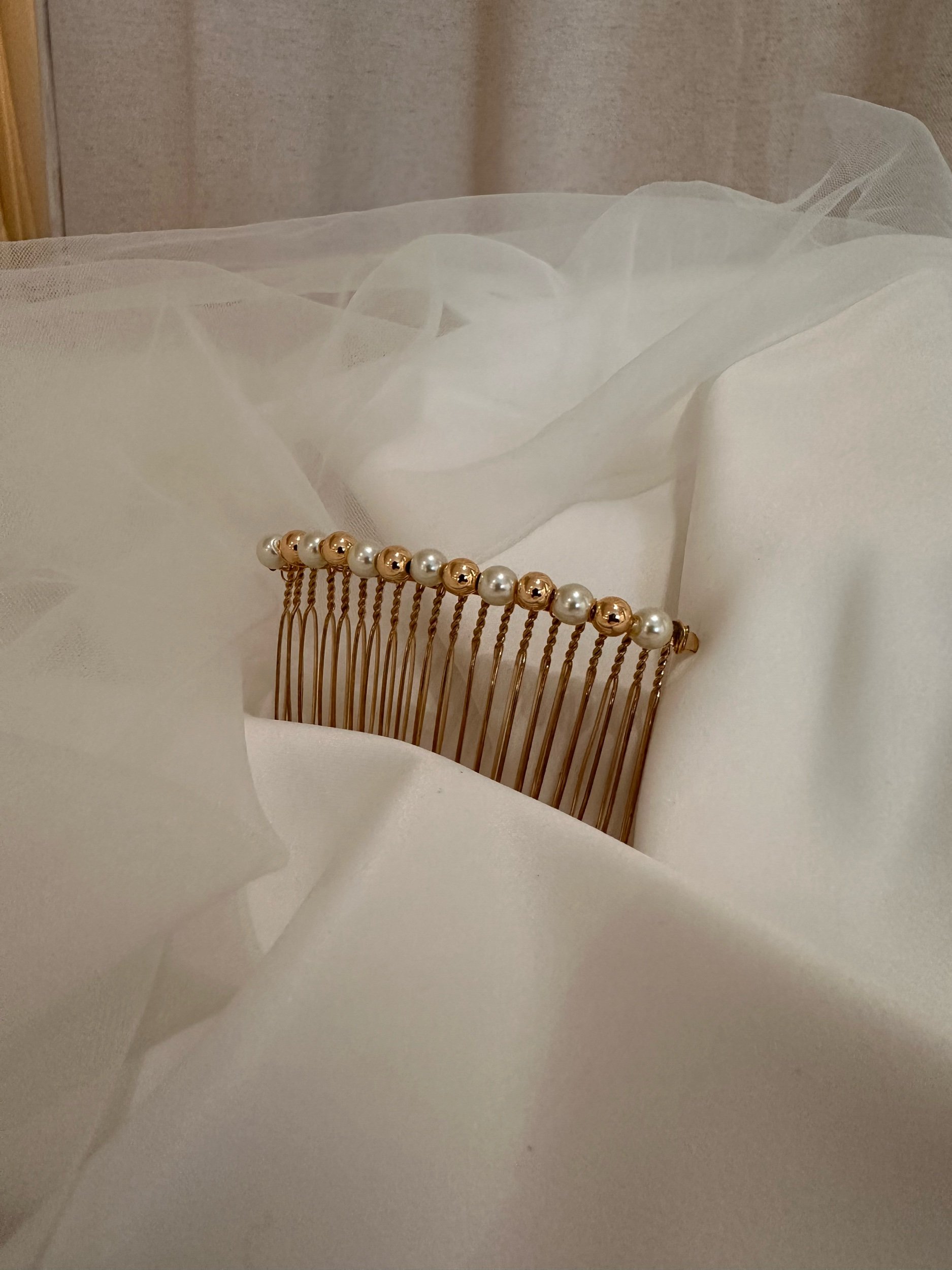 Jewellery › Treehouse Jewellery • Honeysuckle hair comb Image 1 of 2 Image 2 of 2 Treehouse Jewellery • Honeysuckle hair comb £30.00 Gold plated beads and glass pearls create this simplistic gold hair comb. Quantity: Purchase Added! Gold plated beads and glass pearls create this simplistic gold hair comb.