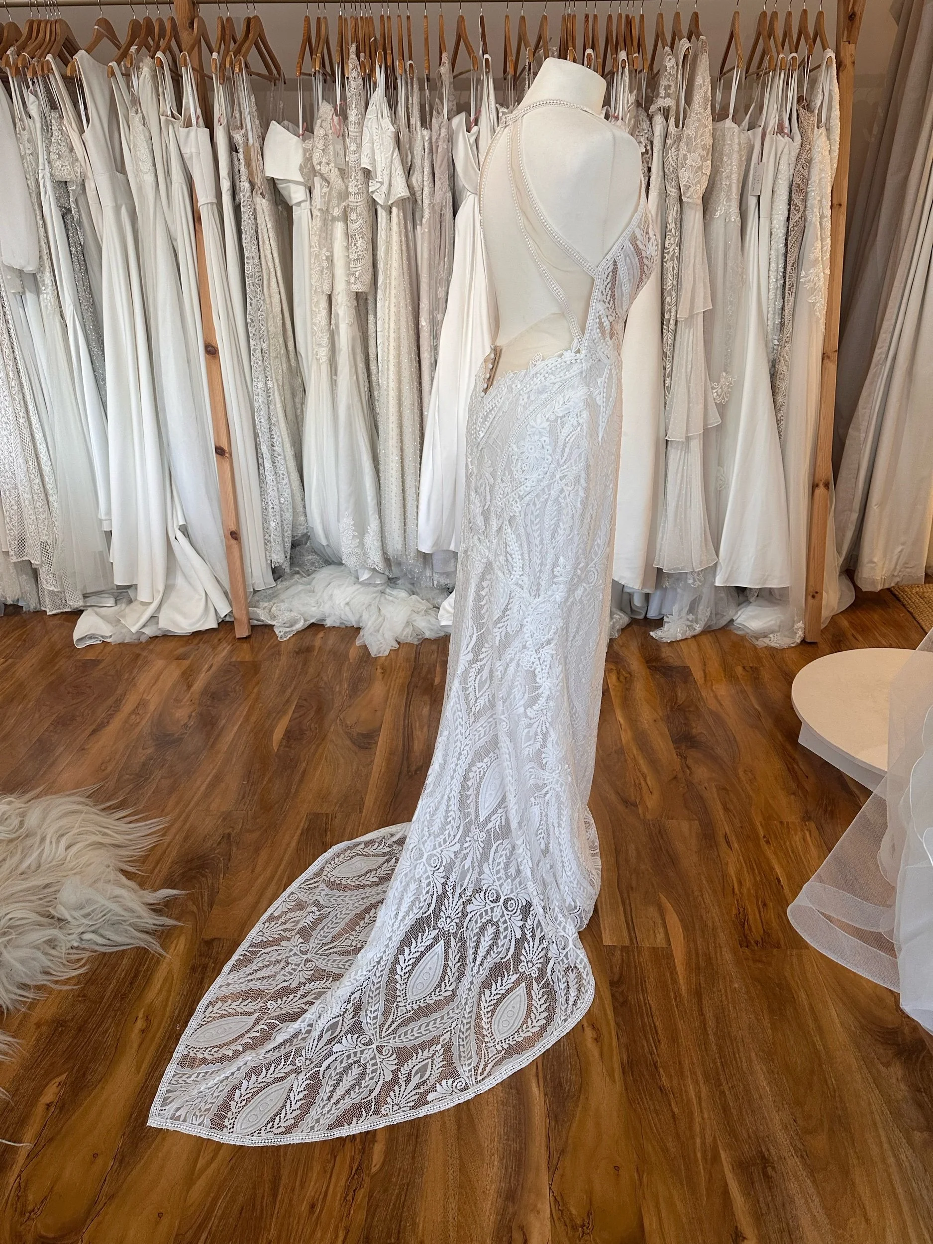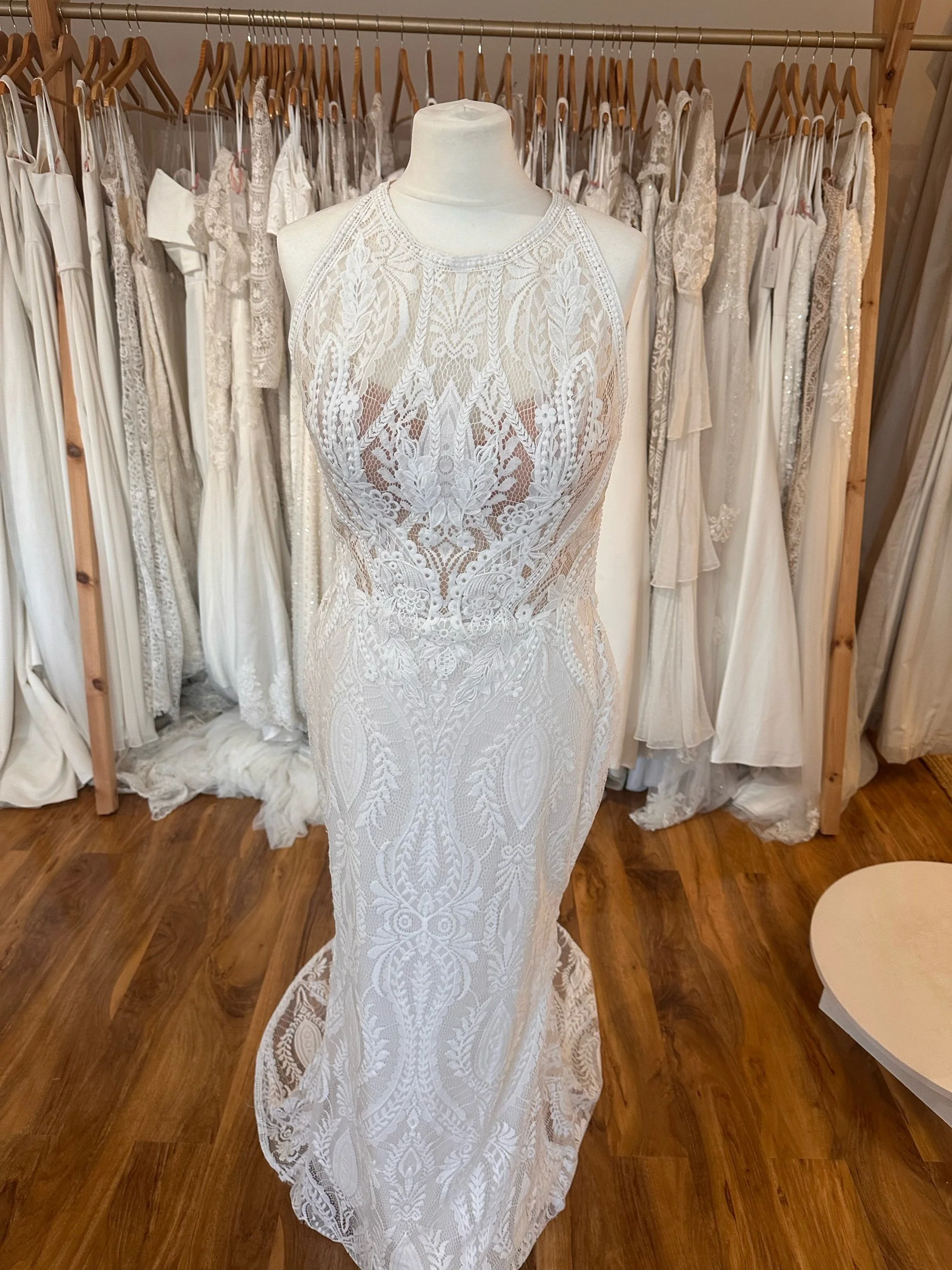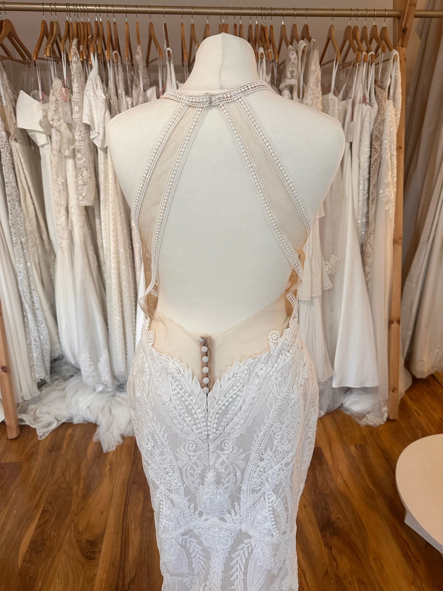 This bold sheath gown has a botanical Chantilly lace with a high neckline and open teardrop back.