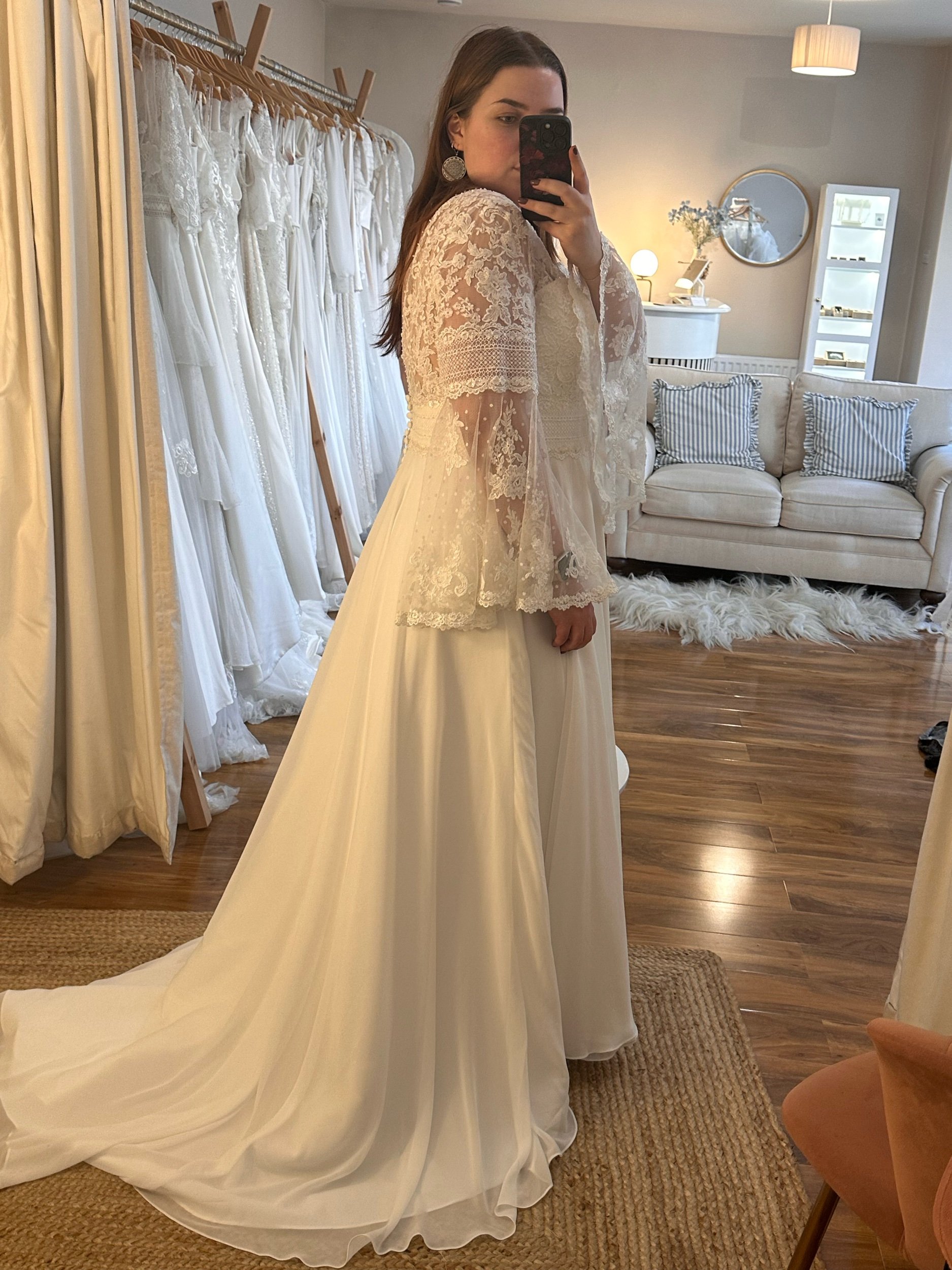 This unusual gown offers a boho look, with its lace bodice and flared sleeves. Its lightweight chiffon skirt is perfect for a spring or summer wedding!