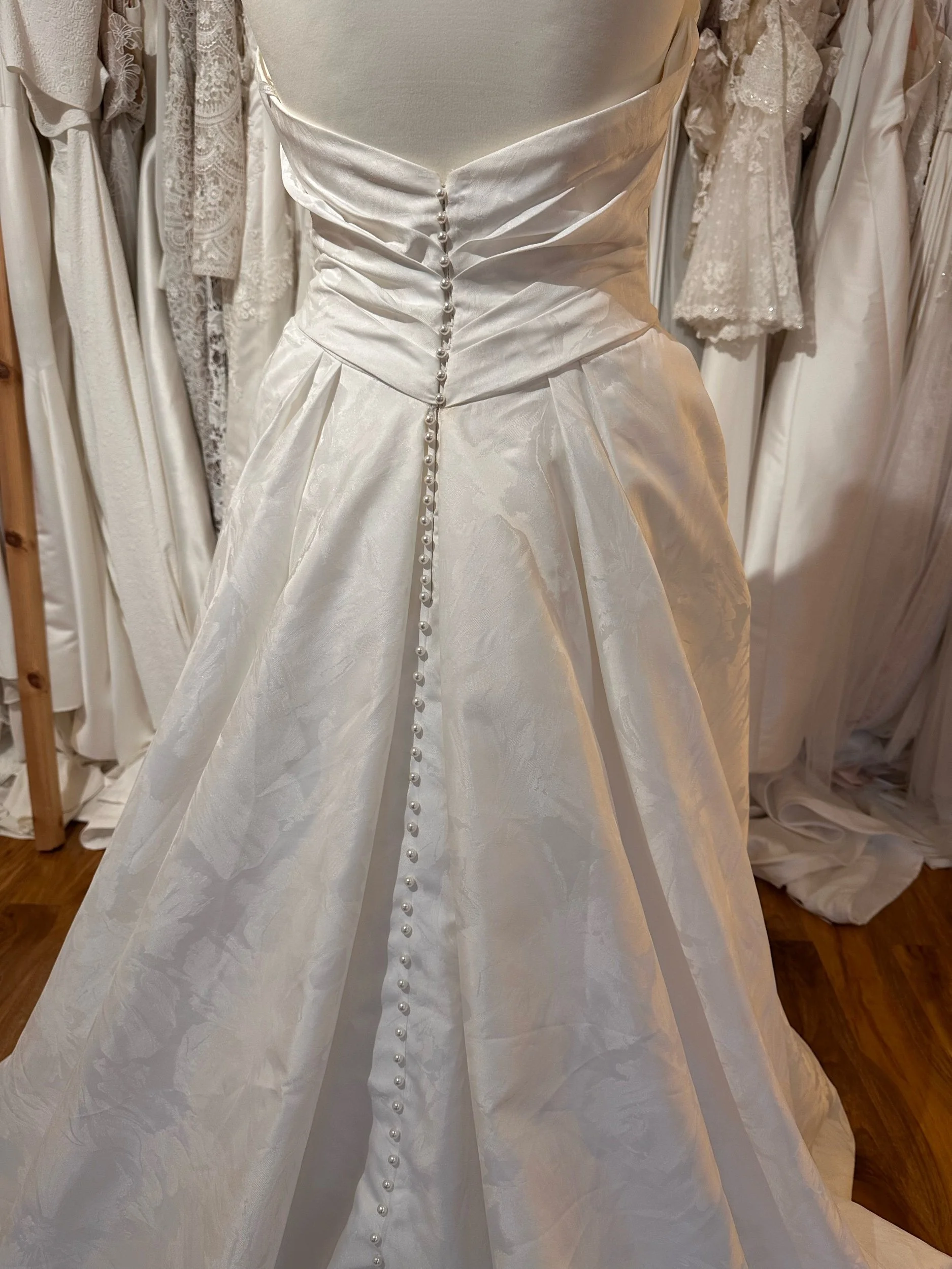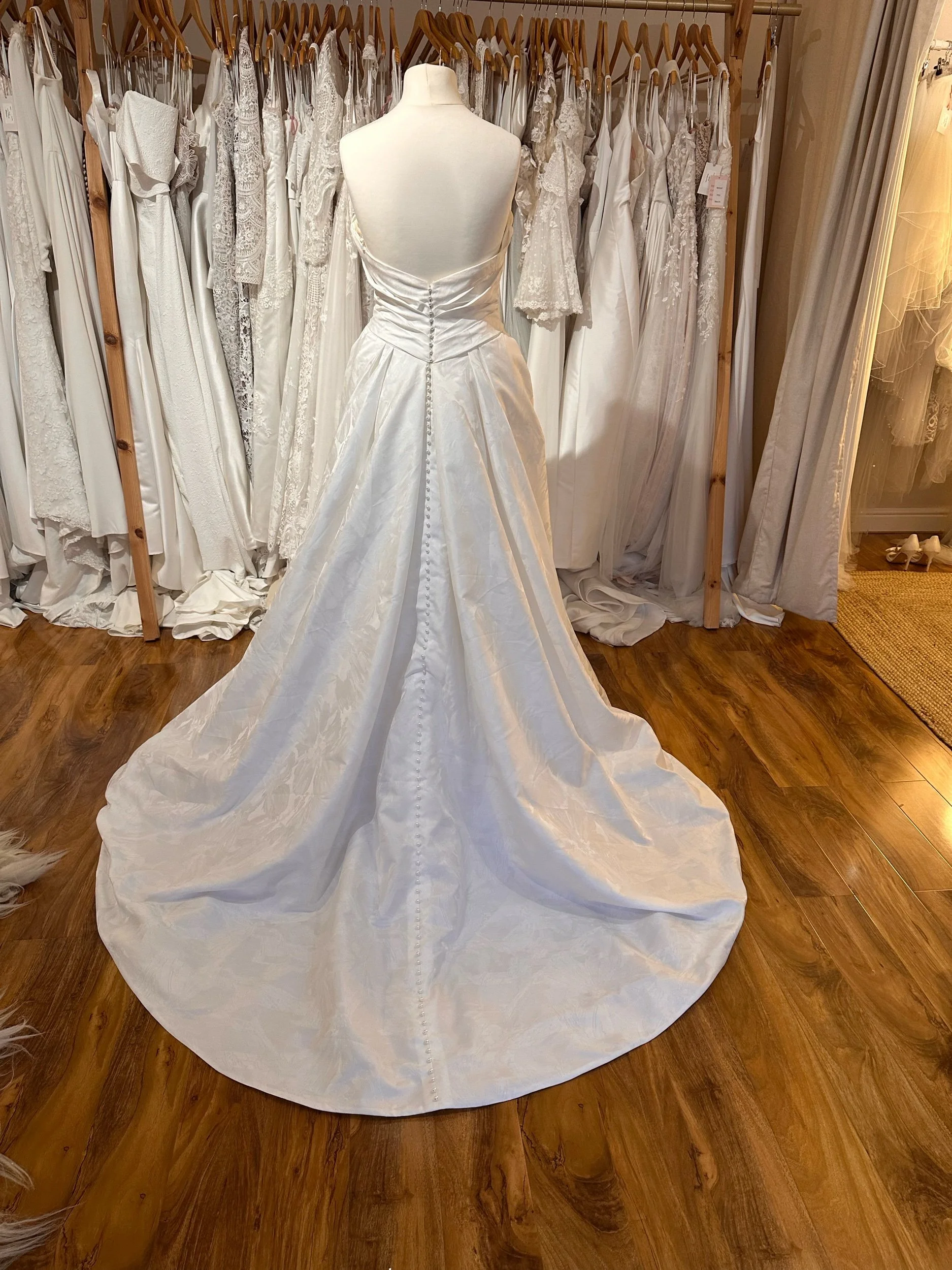 Brontë is made from a glorious embossed jacquard fabric, covering a striking strapless bodice and a full a-line skirt. Size 12