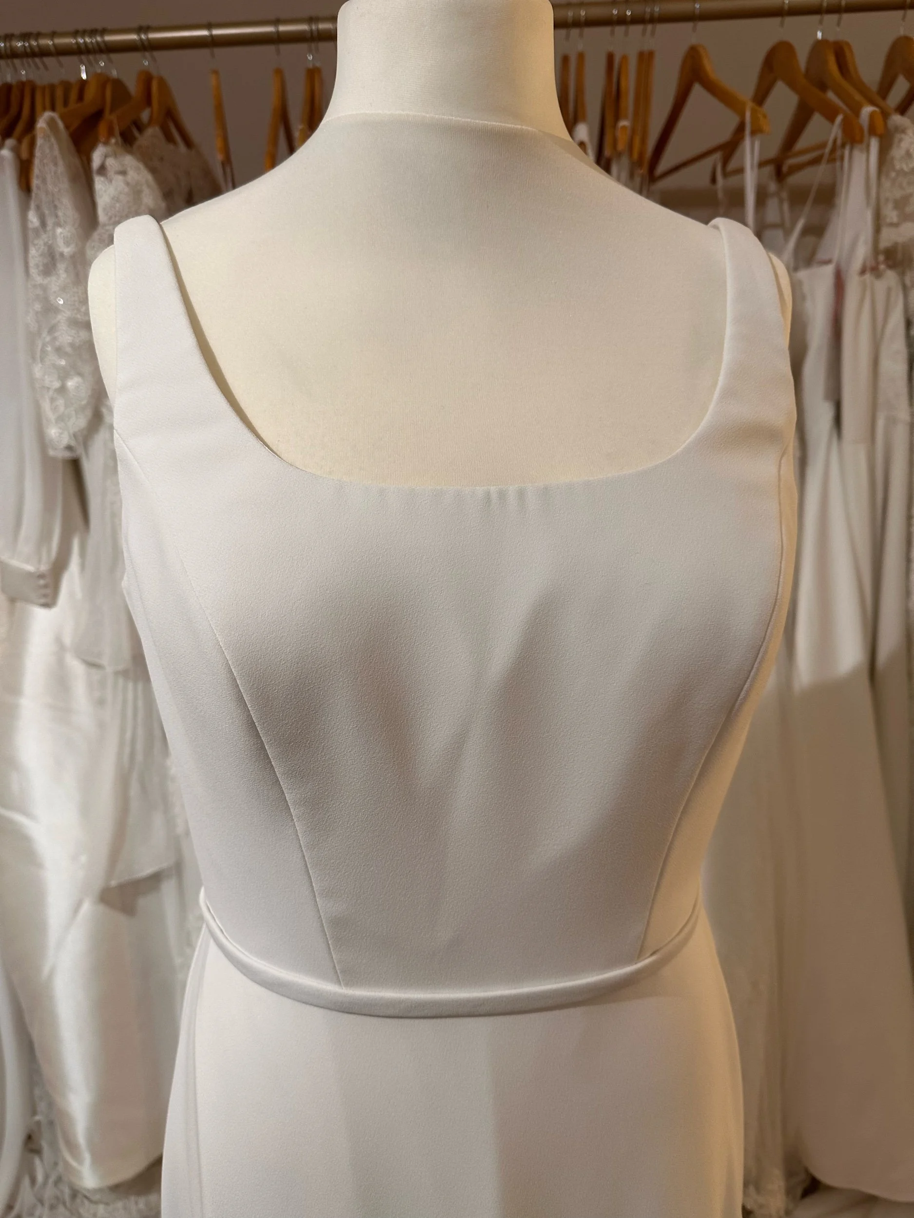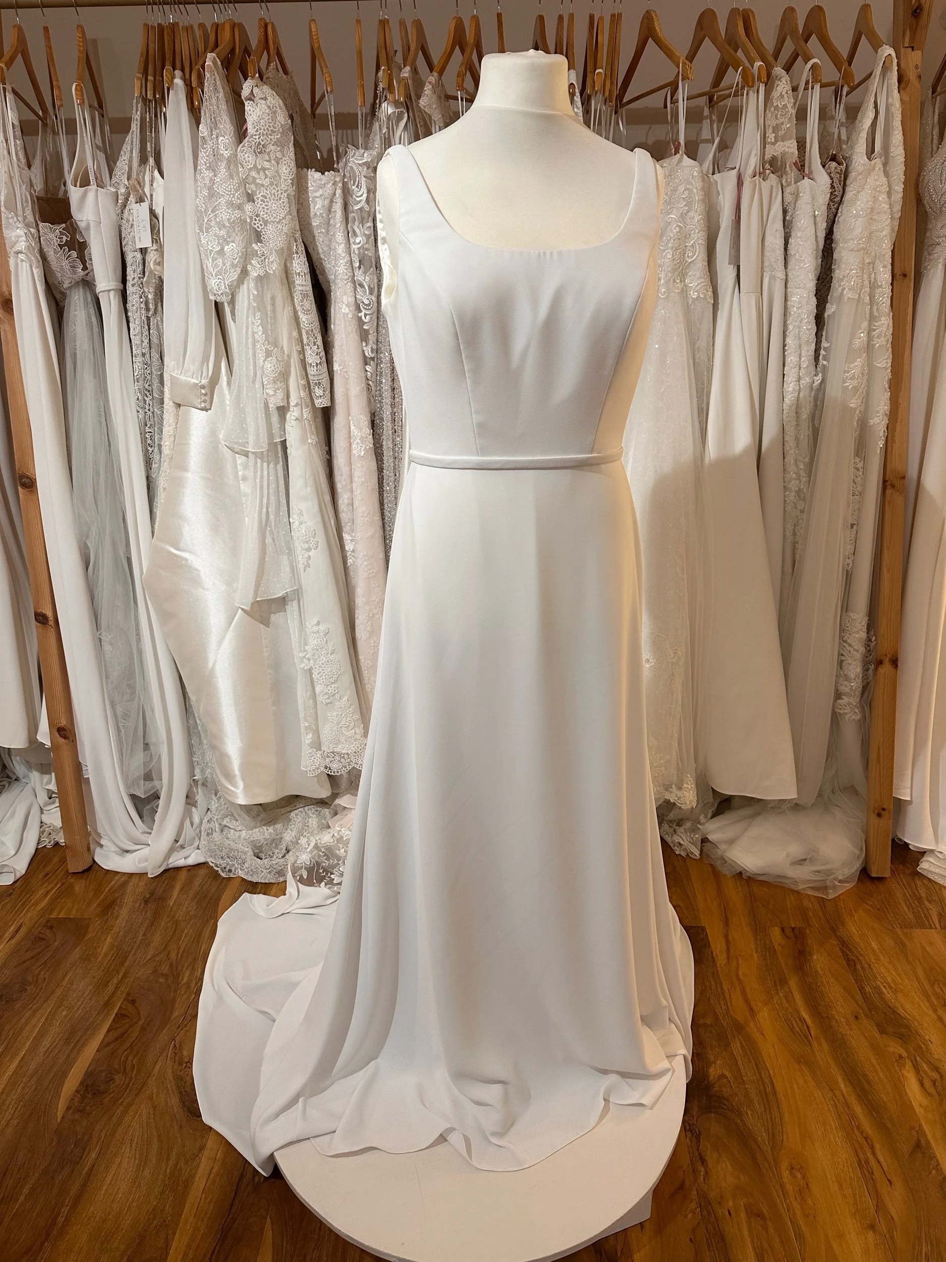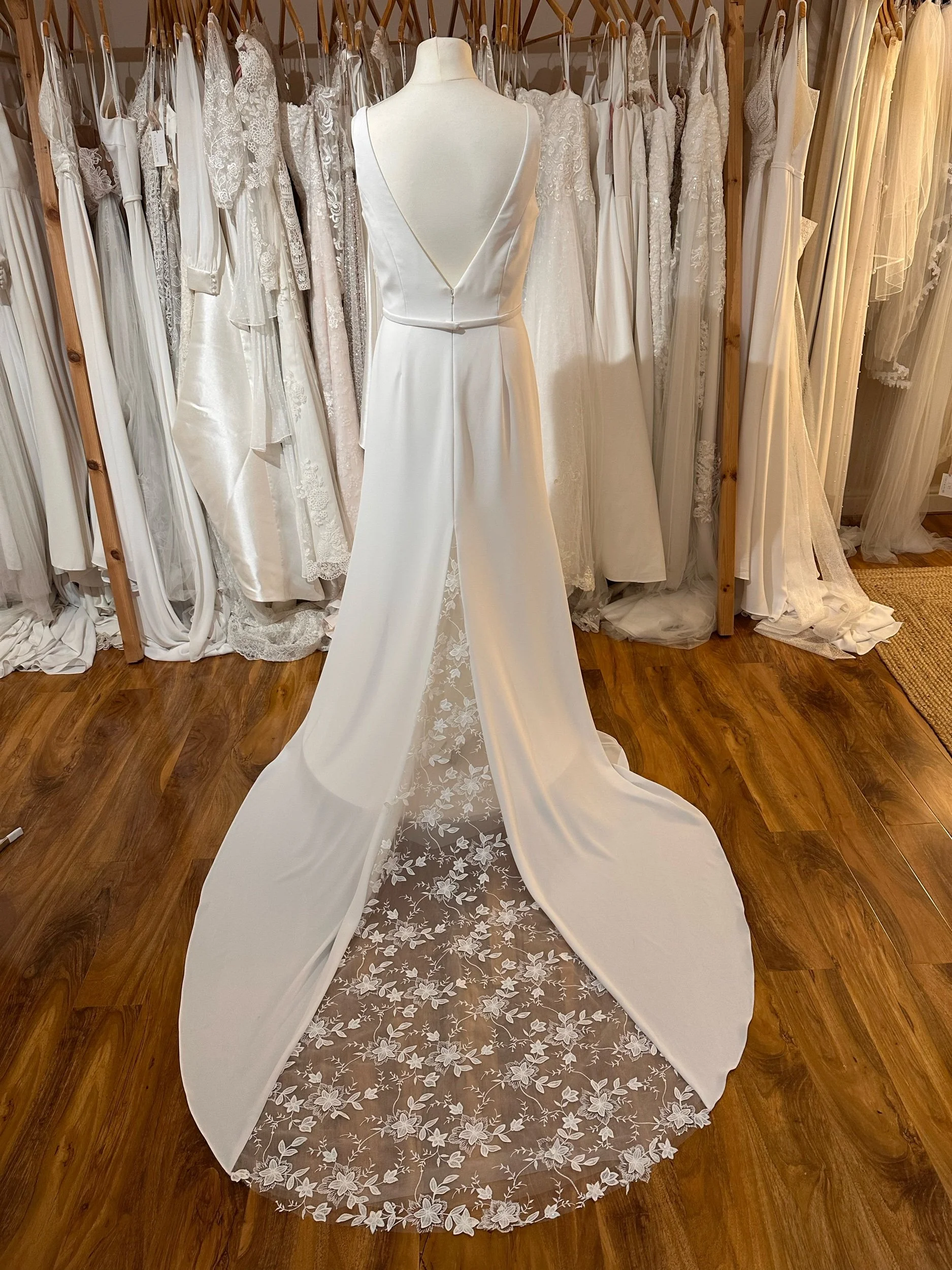 A gorgeous crepe gown with a lace insert panel at the back. Perfect for those wanting a simple dress with a bit of detail. Size 16