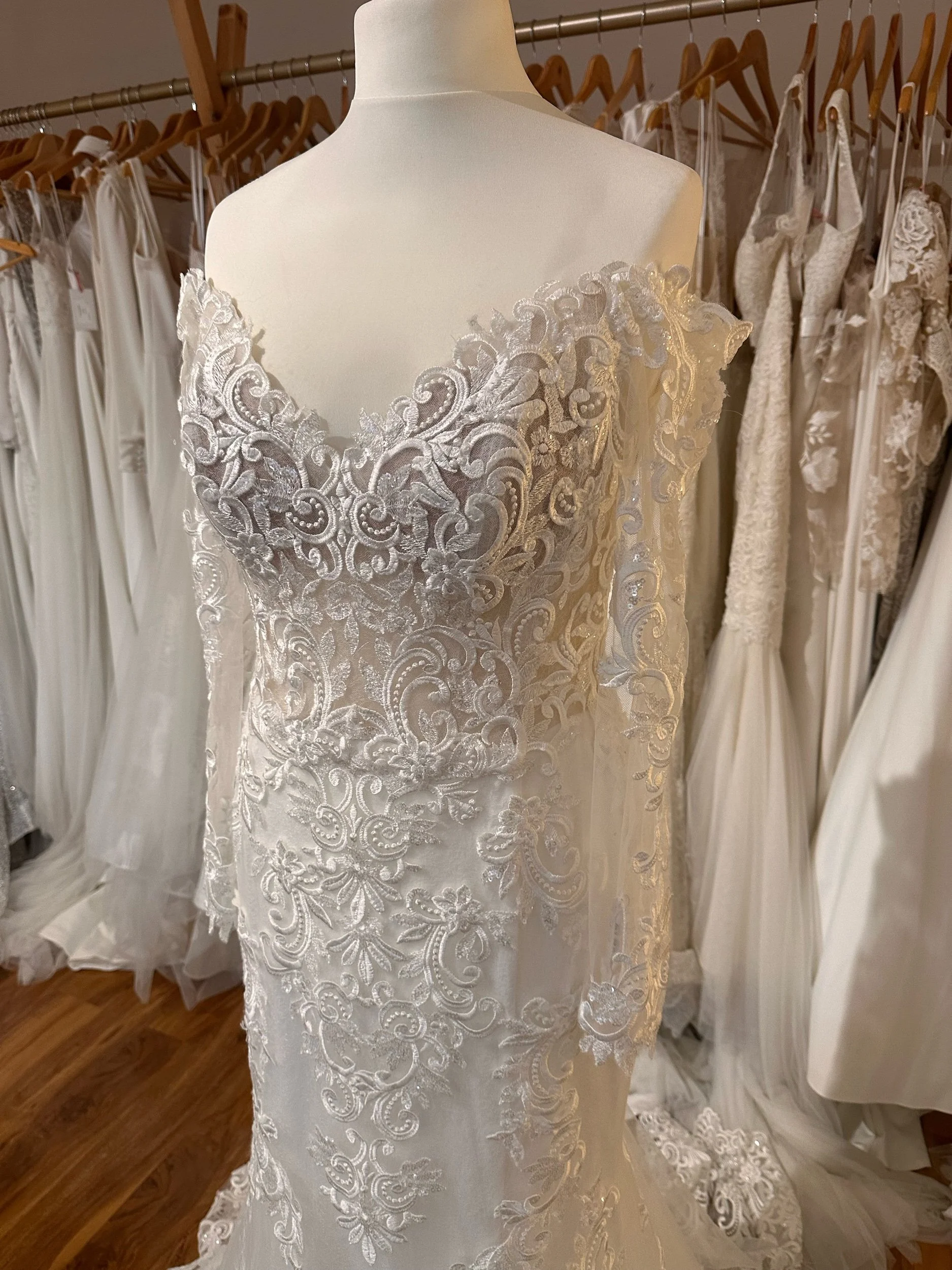 A beautiful off the shoulder lace dress with sleeves. This gorgeous fitted sheath dress falls down to a beautiful lace train. Size 16.